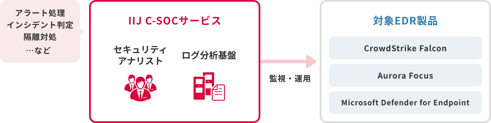 IIJサービスのほか、ファイアウォールやEDRなどのお客様運用機器が対象です。詳細は監視対象の一覧をご覧ください。