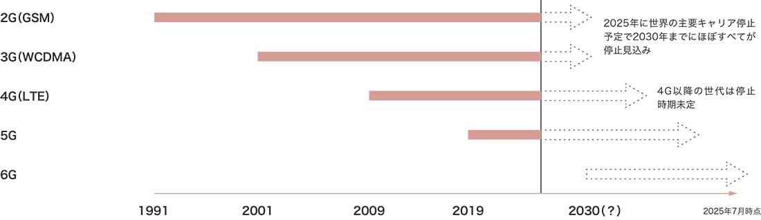 3G停波で発生する問題の解説に入る前に、セルラー方式のモバイル無線技術の進化について説明します。2Gから続く、現在のモバイルの無線技術は1991年の2G導入から約10年おきに新しい無線規格が商用サービスに導入され、進化してきました(図-1)。