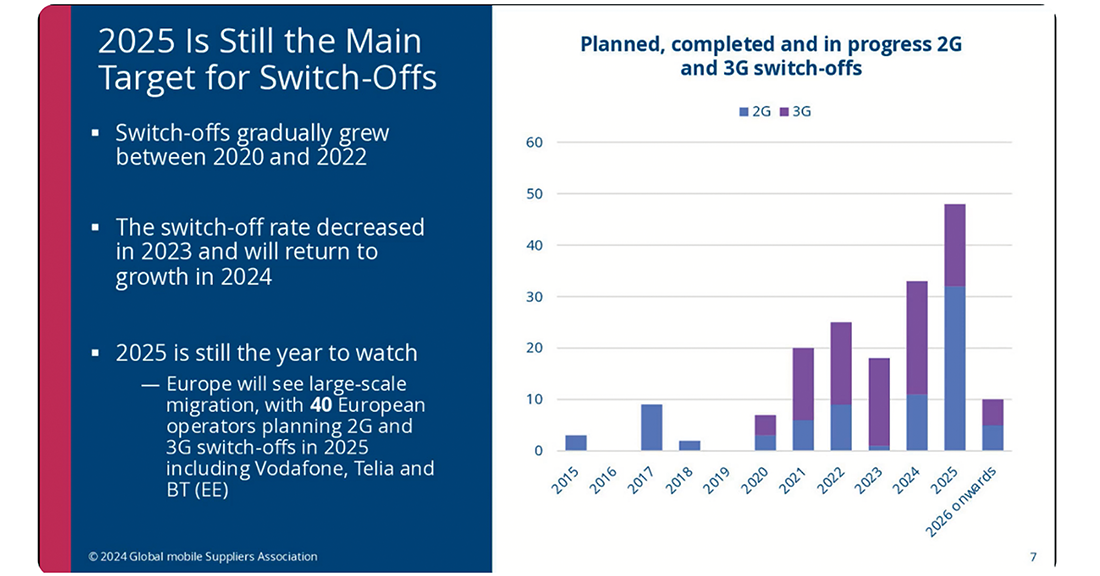 そのため、どこかのタイミングで古い無線規格の利用を止めて、新しい無線規格に移る必要があります。3G停波がまさにこの状況となり、自然な流れとなります。図-1を補足する資料として、世界の端末ベンダーの業界団体GSAが公開している世界のキャリアの2G/3Gの停波状況の推移を示します(図-2)。2025年をピークとして2G/3Gの停止が相次ぎ、4G以降の無線世代に一気に移行します(図-2)。