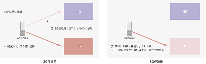 このような状況を想定して、端末は新旧の無線規格に対応するように作り込まれており、新旧の無線網が存在している状態では問題になりません。しかし、今回の3G停波のように古い無線網が廃止される場合に、この連携ができる前提で作られた端末では問題となります。以下の解説でこの問題の詳細について説明します。