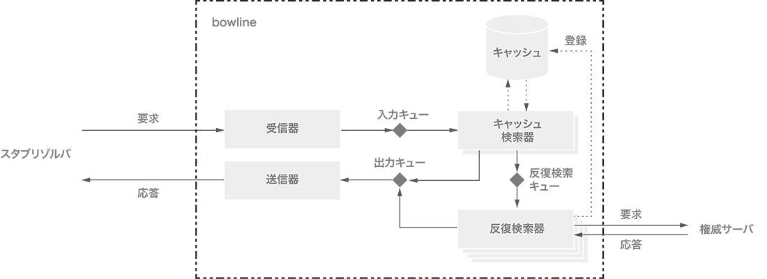 キャッシュ検索器は、グローバルな入力キューからInputを受け取り、キャッシュを検索します。この動作はブロックされません。検索に成功すれば、結果をOutputというデータ型で表現して、Inputから参照されている出力キューへ格納します。失敗すれば、グローバルの反復検索キューにInputをリレーします。bowlineのデフォルトでは、キャッシュ検索器の数は4個です。