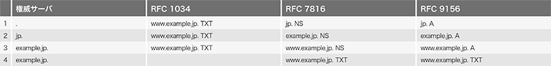 表-1に、www.example.jp.のTXT RRを解決する際の問い合わせ名と問い合わせRR型をまとめます。bowlineは、反復検索としてRFC 9156で定義される「問い合わせ名最小化」のみを用います。表-1のRFC 9156の列を以下で詳細に説明します。