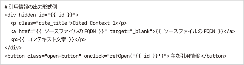 更に、各チャンクに付加している識別情報には、データソースファイルのFQDN(PDFの場合はページ番号を含む)も付与しています。そのため、システムプロンプトでは以下のような引用情報の出力形式を指定し、生成回答の直下に引用元を明示するようにしています。これにより、利用者はボタンをクリックするだけで、引用情報をテキスト表示し、Webサーバ上のソースファイルへも即時アクセスできます。