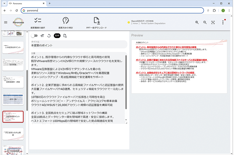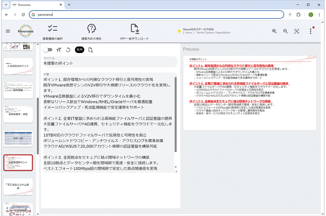 社内RAG基盤の運用が安定した段階で、新たなWebアプリとして提案書生成ツール「Panorama」の開発が進められました。営業担当やエンジニアが要件に応じてPowerPoint形式の提案書を作成する業務は、社内テンプレートからスライドを選別・編集する手作業に多くの時間を要していました。こうした課題を解決するために開発されたのが本ツールであり、要件入力から提案書ドラフトの自動生成までを簡単な操作で行える仕組みを提供しています(図-3)。