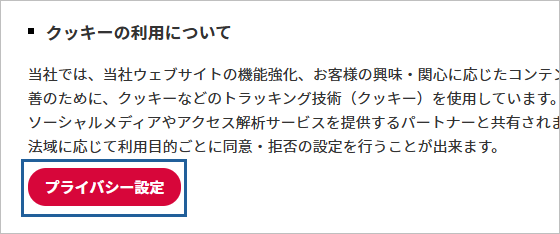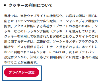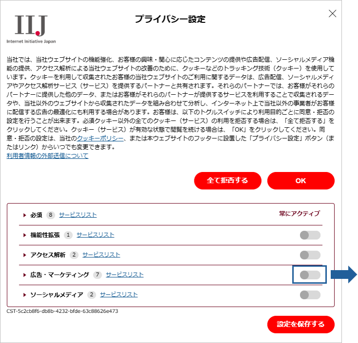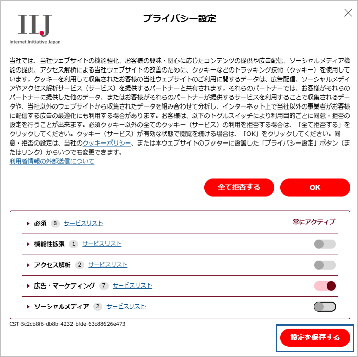 お客様は、IIJのWebサイトで表示されるクッキーバナーと設定によって、IIJのWebサイトもしくは第三者(アドテクパートナー)に、Webサイトの機能に厳格に必要でないクッキーの許可 / 拒否を選択することが可能です。