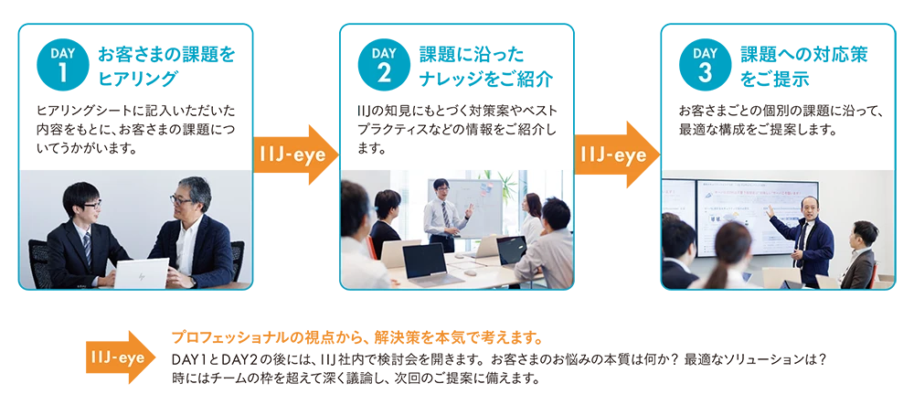IIJのスペシャリストが各企業のお悩みにとことん寄り添い、解決へ向けたアクションをともに描く、3日間の無料ワークショップ