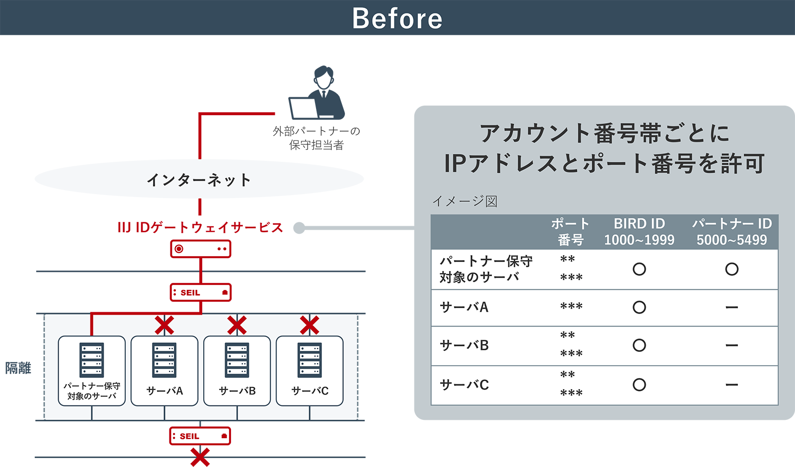 従来の「IDゲートウェイサービス」では、「ポリシーマネージャー」で、ユーザ/ユーザグループ/サービスホスト/サービスホストグループに対するアクセス権をアクセス制御ルールとして細かく設定することができ、アカウント番号帯ごとに、接続先サーバ(IPアドレス)とプロトコル/ポート番号を許可することで制御していました。また、システムごとのサーバ群のセグメントの入口と出口に、IIJが開発した仮想ルータ「SEIL/x86」を設置してフィルタリングすることで、外部からの不正なアクセスを防ぎ、パートナーの担当者が、保守対象のシステムのサーバを踏み台にして、別のサーバにアクセスできないよう制御していました。